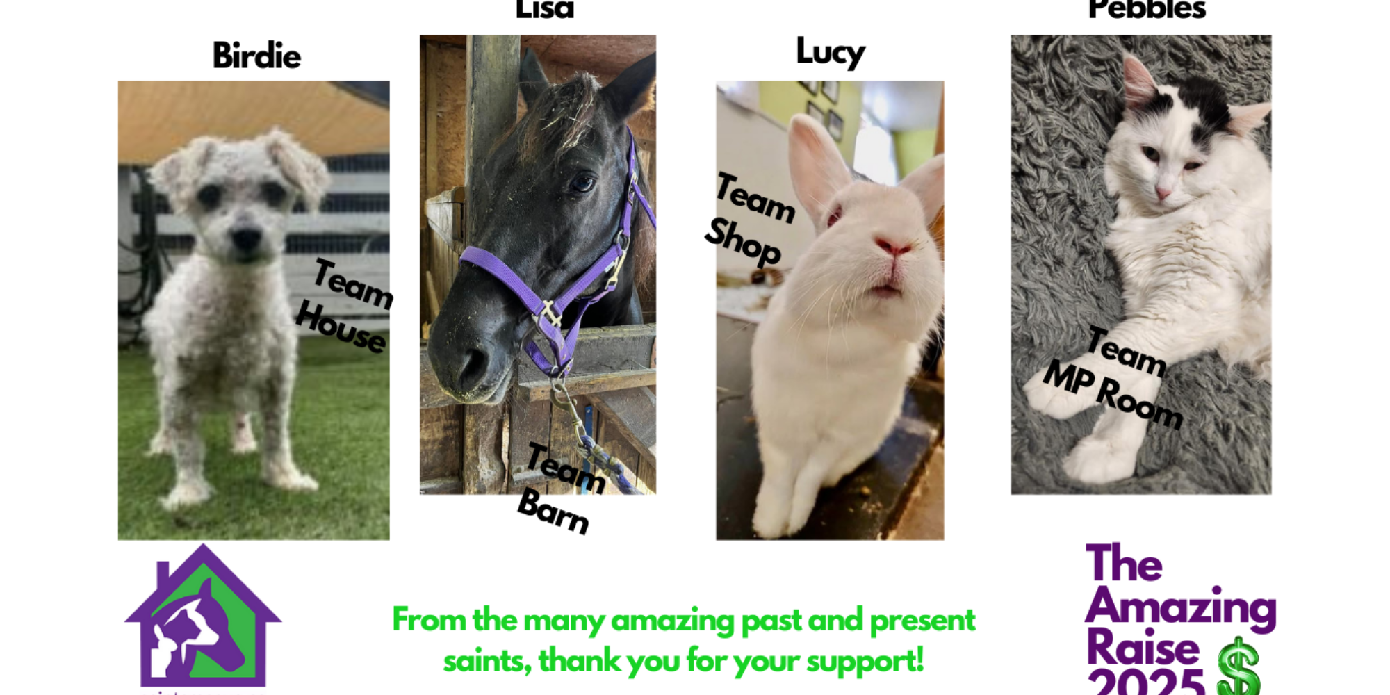 The Amazing Raise has always brought fun to fundraising. The SAINTS' animals are divided into four teams based on the area of SAINTS they call home: the House, the MP Room, the Barn, and the Shop. Each group races to raise the most money for their respective areas, and it's all very exciting for such a great cause! Each group has a team captain, and we'll be sharing their stories to showcase the types of animals that come to live at SAINTS.